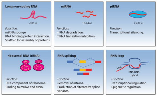 Noncoding DNA covers 95% of DNA sequences in the human genome, most of which are transcribed into various non-coding RNAs (ncRNAs) species which play a role in regulating gene expression. Non-coding RNAs can be classified based on their size. Those having a size less than 200 bp are called small non-coding RNAs (sncRNAs) while those above 200 bp are called long non-coding RNAs (lncRNAs) [17]. Examples of sncRNAs include microRNA (miRNAs), small interfering RNAs (siRNAs), Piwi-interacting RNAs (piRNAs) and small nucleolar RNAs (snoRNAs). Figure 1 reports a list of ncRNAs involved in TGCTs and their biological functions.