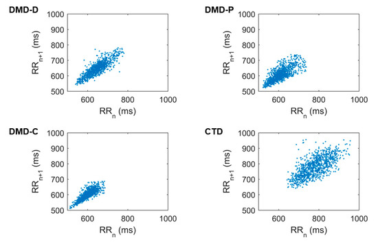 Visual analysis exposed changed dispersion, of which the DMD-C group presented less dispersion and CTD greater. Amongst the DMD-D and DMD-P groups, greater dispersion was perceived in the DMD-P group, a situation that indicated an improved HRV, and reduction in the DMD-D group (Figure 1).