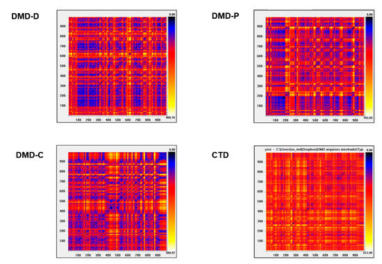 Recurrence Plot. DMD-D, Duchenne Muscular Dystrophy-Deflazacort; DMD-P, Duchenne Muscular Dystrophy-Prednisone/Prednisolone; DMD-C, Duchenne Muscular Dystrophy–No corticosteroids; and CTD, Control typical development.