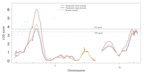 LOD score plots for QTLs affecting weights of the pectoralis minor muscle, pectoralis major muscle and breast muscle on chromosome 2 and linkage group 4b assigned to chromosome 4. Horizontal dashed and solid lines show genome-wide 10% and 5% significance threshold levels (see Table S1 for details).