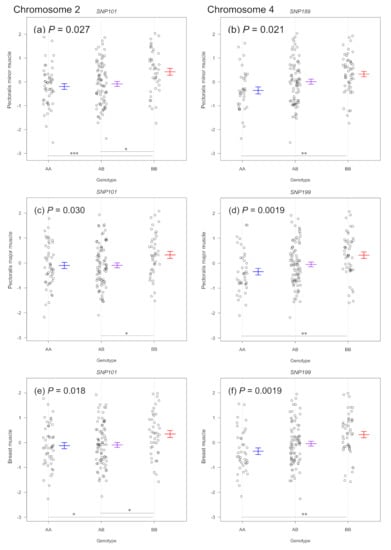 Genotype effect plots of the SNP markers nearest to QTLs for weights of (a,b) pectoralis minor muscle, (c,d) pectoralis major muscle and (e,f) breast muscle on chromosomes 2 and 4. Each circle shows muscle weight in SD unit for an animal. Horizontal solid bars for each genotype show mean ± SE. P values were obtained from a one-way ANOVA. * P < 0.05, ** P < 0.01 and *** P < 0.001 on horizontal dashed lines refer to statistical differences between two genotypes (Tukey’s honestly significant difference test). A: NAG allele, B: WPR allele.