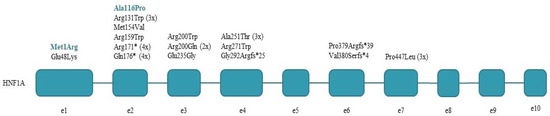 HNF1A-MODY is mainly the result of haploinsufficiency due to loss-of-function mutations [15]. The HNF1A gene has three isoforms generated from the same promoter by alternative splicing and it has three functional domains: an N-terminal dimerization domain, a DNA-binding domain and a C-terminal transactivation domain [16]. This gene is considered to be polymorphic; mutations have been described in every domain of the gene, with no mutational hot-spots [17]. To date, about 500 disease-causing small scale HNF1A mutations have been reported in the professional version of the HGMD (Human Gene Mutation Database, version 2021_1) associated with the MODY phenotype, the majority of them being missense alterations resulting in amino acid change. More than 80% of HNF1A mutations have been reported in exons 1–6 of 10, affecting all three isoforms of the gene and having a lower average age of diagnosis as compared to those who have mutations in exons 8–10. Patients with truncating HNF1A mutations generally have a younger age of onset compared to those who have a missense mutation, suggesting phenotype variability of MODY3 patients based on mutation type and location [9,18].