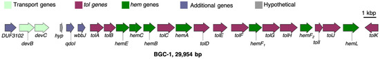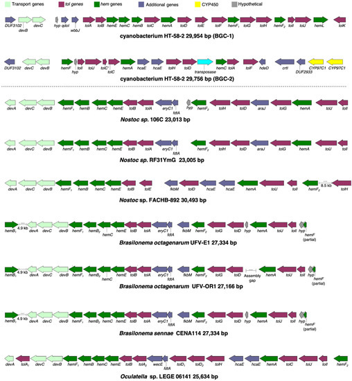In addition, seven cyanobacterial genomes were identified with similar hem and tol genes, including Nostoc sp.106C, Nostoc sp. RF31YmG, Nostoc sp. FACHB-892, three Brasilonema isolates, and Oculatella sp. LEGE 06141 (Table 1). The alignment of all BGCs is shown in Figure 4.