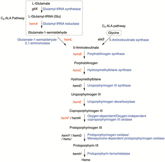 - Hansson, M.; Rutberg, L.; Schröder, I.; Hederstedt, L. The Bacillus subtilis hemAXCDBL Gene Cluster, which Encodes Enzymes of the Biosynthetic Pathway from Glutamate to Uroporphyrinogen III. J. Bacteriol. 1991, 173, 2590–2599. [Google Scholar] [CrossRef] [PubMed][Green Version]