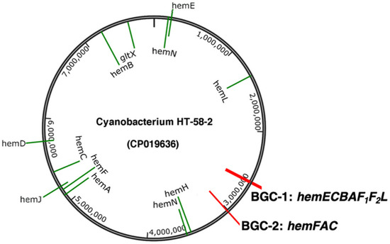 Distribution of hem genes throughout the genome of cyanobacterium HT-58-2 (7.85 Mbp), except in the two proposed tolyporphins clusters (BGC-1 and BGC-2).