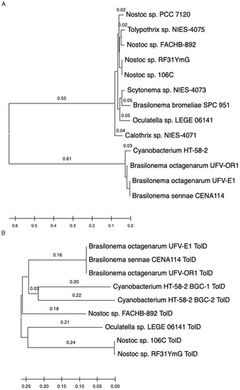 To evaluate the relationship between the phylogeny of the cyanobacteria containing related tolyporphins BGCs, the 16S rRNA and protein sequences of one component in the BGCs, termed TolD, were analyzed. The reason for evaluating TolD is that the tolD gene is present in all identified BGCs in the eight cyanobacteria. Figure 5A shows the 16S rRNA phylogenetic tree for cyanobacteria identified with probable tolyporphins BGCs. HT-58-2 clearly shows closer relatedness to three Brasilonema strains than to other filamentous cyanobacteria, as previously reported [13]. The TolD phylogenetic tree shows a similar branching pattern as for 16S rRNA (Figure 5B), suggesting the BGCs have the same evolutionary history as the cyanobacteria and were not separately acquired via recent lateral gene transfer. The TolD tree also supports our prior observation [13] that the cyanobacterium HT-58-2 more closely aligns with strains of the genus Brasilonema than with those of Tolypothrix, as originally described [8].