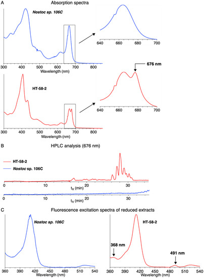 - The HPLC chromatogram with absorption detection at 676 nm (panel B) of the extract from HT-58-2 shows multiple bands with retention time tR ~26–32 min. Such bands are characteristic of the mixture of dioxobacteriochlorin-type tolyporphins. Chlorophyll a, which absorbs in the same wavelength region, elutes at longer time [15]. No such bands were observed for the chromatogram of the extract from Nostoc sp. 106C.
