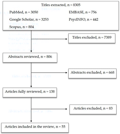 The first selection excluded 7389 titles because they were: duplicates or duplicated results, not related to the scope of the paper or not informative enough. The second selection excluded 668 abstracts after being read and reviewed, as the information reported did not fulfill the scope of our paper and/or the presented information did not seem relevant to the discussed topic. Subsequently, 83 publications were excluded after being completely read and evaluated, as they did not provide enough information and/or were not sufficiently in line with our review. Finally, 55 papers were included in the present review (Figure 1).