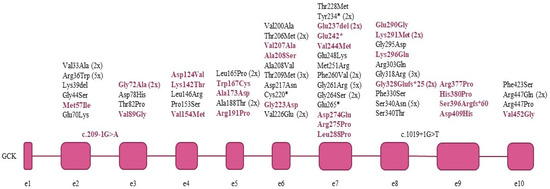 In the case of GCK-MODY, a mildly elevated glucose level is caused by heterozygous loss-of-function mutations in the GCK gene. Any of the 10 exons and promoter of the pancreatic isoform of the GCK gene might be affected as no mutational hotspots have been identified. The mutations might affect enzyme kinetics or protein folding [4,5]. To date, almost 800 disease-causing small scale GCK mutations have been reported in the professional version of the HGMD (Human Gene Mutation Database, version 2021.1) associated with the MODY phenotype, the majority of them being missense alterations resulting in abnormal structure and/or function of the mutant protein, often affecting its kinetic parameters.