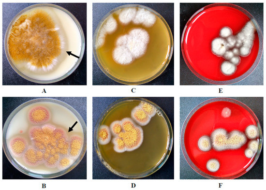 Growth of A. flavus 1 on: (A) SMA; (C) PA; (E) BA. Growth of A. ochraceus L-1 on: (B) SMA; (D) PA; (F) BA. The arrows show the zone of casein hydrolysis around the micromycete colonies.