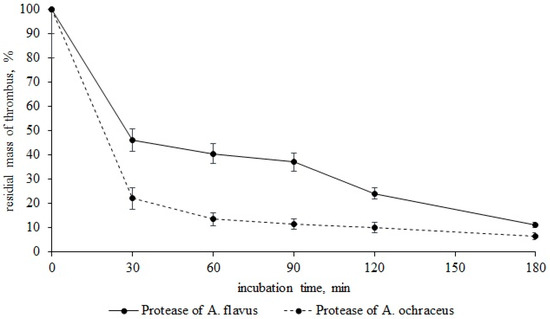 As seen from Figure 3, proteases A. flavus 1 and A. ochraceus L-1 dissolve blood clots rather quickly. Therefore, after 30 min of incubation of a thrombus with protease of A. flavus 1, the residual mass of a thrombus was 46.2%. Incubation of a thrombus with incubation with protease of A. ochraceus L-1 was 22%. In both cases, the thrombus was hydrolyzed by 70% in 90 min. After 180 min of incubation, the residual masses of the thrombus with proteases A. flavus 1 and A. ochraceus L-1 was 11 and 6.4%, respectively. In view of the fact that the proteases of these micromycete strains previously showed fibrinolytic activity, it is obvious that thrombus fibrin is hydrolyzed directly under their action, and this is what leads to the dissolution of thrombi [29,30]. Thus, in addition to globular proteins, proteases of both micromycetes can also hydrolyze fibrillar proteins of the bloodstream, i.e., we can talk about their complex effect on the proteins of the hemostasis system. This means that when Aspergillus spores enter the bloodstream, they may secrete proteases for the use of human proteins present in the bloodstream as nutrient substrates [31,32].