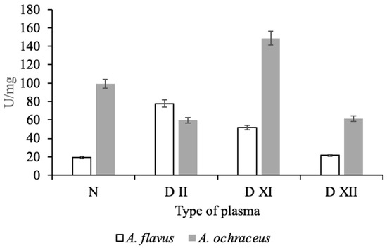 Of considerable interest is the assessment of the severity of the action (specificity) of the isolated micromycete proteases in relation to certain proteins of the plasma hemostasis system, which are responsible for maintaining blood viscosity and the balance between blood coagulation and fibrinolysis. For this, various human blood plasmas, deficient in one of the coagulation factors, were preincubated with proteases from micromycetes. As an analytical signal, the activity of factor X formed as a result of coagulation, one of the key proteins of the hemostasis system, was determined with chromogenic peptide substrate Z-D-Arg-Gly-Arg-pNA. As can be seen from the data presented in Figure 4, when incubated with normal plasma containing all components within the physiological parameters, including factor X, protease A. ochraceus L-1 exhibited high activator factor X activity (99.2 U/mg of protein), while protease A. flavus 1 exhibited insignificant factor X activity (19.3 U/mg of protein).