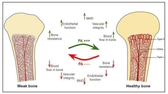 The effects of physical activity or mechanical loading on bone parameters. The benefits of physical activity on bones, their microarchitecture, and microvascularity are multiple, including improved BMD, bone strength, bone blood flow, and the vascular integrity. The absence of physical activity deteriorates these bone and vascular parameters. Columnar type-H and sinusoidal type-L vessels are bone microvessels located in the metaphysis and in the diaphysis, respectively. Modified from [].