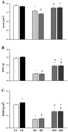 Bone mineral content and density. (A) Femoral area. (B) Bone mineral content. (C) Bone mineral density. Data are means ± SEM of 10 animals in each group. CS, control sedentary. CE, control exercise. DS, diabetic sedentary. DE, diabetic exercise. DSI, diabetic sedentary insulin. DEI, diabetic exercise insulin. * different from de CS. § different from CE. # different from DS. + different from DE (p ≤ 0.05).