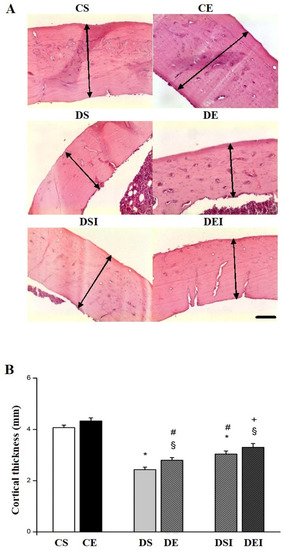 Femoral cortical bone thickness. (A) Representative photomicrographs of the femoral midshaft of the animals in the experimental groups. Black arrows: cortical thickness. Hematoxylin and eosin staining. 10×. Bar: 100 μm. (B) Mean data for cortical thickness. Data in panel B are means ± SEM. CS, control sedentary. CE, control exercise. DS, diabetic sedentary. DE, diabetic exercise. DSI, diabetic sedentary insulin. DEI, diabetic exercise insulin. * different from CS. § different from CE. # different from DS. + different from DE (p ≤ 0.05).