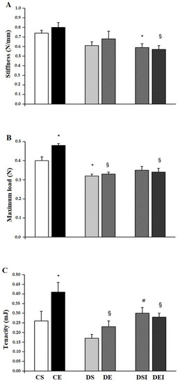 Femoral midshaft mechanical properties. (A) Stiffness. (B) Maximum load. (C) Tenacity. Data are means ± SEM. CS, control sedentary. CE, control exercise. DS. diabetic sedentary. DE, diabetic exercise. DSI, diabetic sedentary insulin. DEI, diabetic exercise insulin. * different from CS. § different from CE. # different from DS. (p ≤ 0.05).