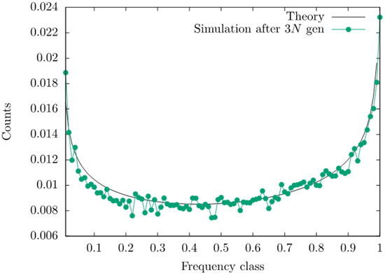 Equilibrium distribution of allele frequencies for a locus with . Simulations are described in [26] and were run for generations. The solid curve is predicted by Equations (12) and (13). The parameter values are s = 0.1, N = , n 200, = 10−5, , = 0.2, and .
