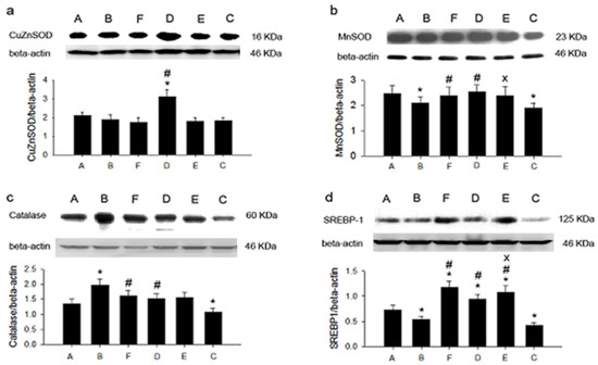 The expression of hepatic antioxidant proteins and SREBP-1 in six groups. (a): CuZnSOD; (b): MnSOD; (c): catalase; (d): SREBP-1. * p < 0.05 vs. group C. # p < 0.05 vs. group E. x p < 0.05 vs. group F. C: control diet; E: control diet plus 0.1% cholesterol; A: control diet plus 0.1% cholesterol plus 2.5% sweet potato leaf powder; B: control diet plus 0.1% cholesterol plus 5% sweet potato leaf powder; D: control diet plus 0.2% cholesterol plus 5% sweet potato leaf powder; F: control diet plus 0.2% cholesterol.