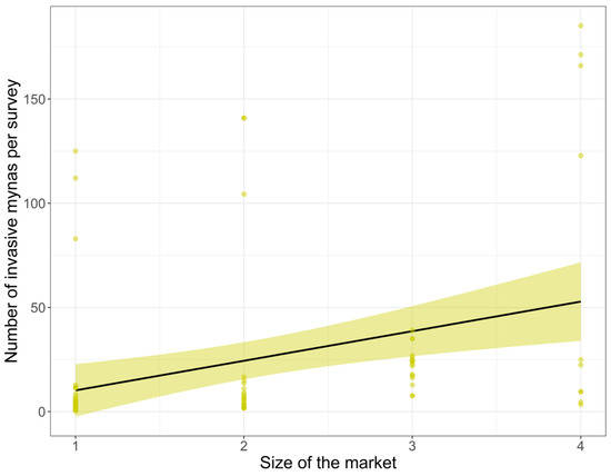 The number of invasive non-native mynas offered for sale in markets was positively related to the size of the market (estimate = 0.710 ± SE 0.267, z = 2.656, p = 0.008; Figure 5), and the variation was similar between years (random effect variance: 0.030).