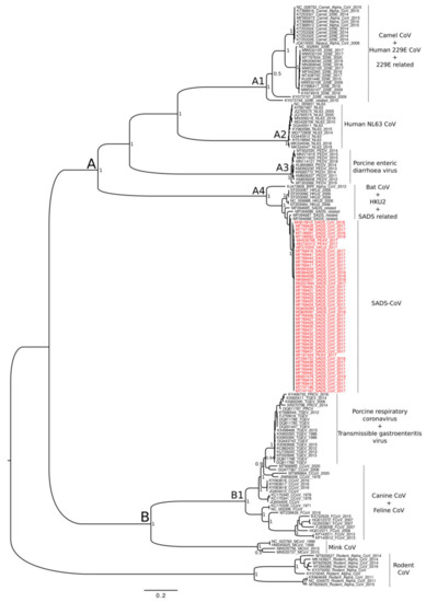 The analyses were based on two datasets. The first dataset was composed by 162 whole genomes of Alphacoronavirus, 48 of which belonged to SADS-CoV, available on 21 June 2021, sampled between 2016 and 2019. The remaining genomes belonged to the most representative groups of the genus Alphacoronavirus, i.e., camel, Human 229E and NL63, PEDV, PRCV, TGEV, mink, canine, feline, HKU2, and Rodent alphacoronavirus. The second dataset, including the same viral specimens, only considered the gene S. All genomes were taken from NCBI Virus database (https://www.ncbi.nlm.nih.gov/labs/virus/vssi/#/, accessed on 21 June 2021).