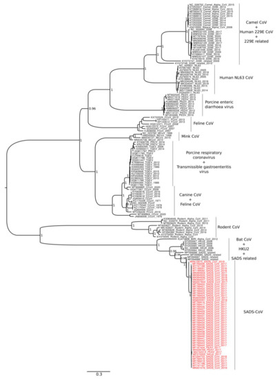 Here, we performed the inference on the phylodynamics of SADS-CoV with the highest level of resolution possible to date using all the publicly available whole genomes whose sampling date were known on 21 June 2021. The evolutionary history of SADS-CoV in the wide context of the whole genus was depicted, also including in the analyses a large heterogeneous pool of Alphacoronavirus.