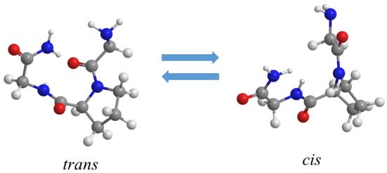 In polypeptide sequences, the amino acid proline (Pro) is considered to have a unique role in determining protein structure and folding. Proline residues are frequently found at bends in the polypeptide chain, and they play a structurally specific role in β-turn [13,14] thanks to their reduced flexibility, which is ideally suited for reversing the direction of the polypeptide chain. The presence of a side-chain pyrrolidine ring severely restricts the rotation around the bond, while the absence of a hydrogen atom on the imide nitrogen prevents its participation in hydrogen bonding [15]. Another unique property of Pro residues is that the energy barrier of rotation of the peptide linkage, X-Pro, of proline with the preceding X-amino acid is significantly lower compared to the regular amide bonds [16]. This implies that the trans–cis isomerization of the X-Pro bond occurs more easily than the usual peptide bonds. The conformational flexibility of the imide bond of proline has been observed to be an important factor in protein dynamics and folding [17,18]. For instance, it has been found that proline-rich regions of the protein immunoglobulin-G are strongly involved in antigen binding by mediating a structural transition in the hinge region of the protein [19]. Trans–cis isomerization about the proline bond is believed to be critical for protein stability [20] because the interconversion between the two isomeric forms is one of the rate-determining steps in protein folding [17,21]. These studies suggested that proline residues can act as a configuration controller in proline-containing proteins, playing a key role in specific biochemical processes [22]. The trans–cis isomerization of the X-Pro bond is of interest for its implication in protein denaturation processes [17,23,24,25], since the incorrect X-Pro isomers in the unfolded forms of proteins has been observed. Some investigations showed that proline isomerization can induce long-range perturbations in the secondary structure of polypeptide chains, thus suggesting the possible function of proline as a molecular switch in proteins [26]. Finally, the trans–cis isomerization of proline has been found to be involved in the gating mechanism of ion channels and in the biomolecular recognition processes of some proteins [27,28].