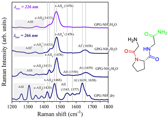 The multi-wavelength UVRR spectra of peptides collected using different excitation wavelengths are rich in information thanks to the quite different UV absorption bands of the various chromophores of the polypeptide chains [29,36,37,38]. Figure 2 displays the UVRR spectra obtained with 266 and 226 nm as the excitation wavelengths of the lyophilized powder of GPG-NH2 and of the aqueous solutions of the tripeptide.