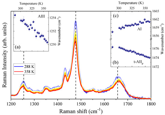 The 266 nm-excited spectra of hydrated GPG-NH2 (1:58 GPG-NH2:water) as a function of temperature in the range 288 K < T < 358 K. Insets: temperature dependence of the central wavenumber positions of the Raman bands of AIII (a), t-AIIp (b) and AI (c).