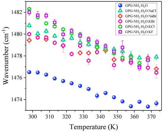 UV excitation at 226 nm selectively enhanced the Raman bands of proline at ≈ 1470 cm−1, which dominated the spectrum of GPG-NH2, as visible in Figure 2. Although the GPG-NH2 contains only one X-Pro bond, the Raman band associated with this molecular moiety could be clearly detected against the large background of other peptide bonds in the UVRR spectra excited at 226 nm. Figure 4 displays the 226 nm-excited Raman spectra of the binary peptide/water and the ternary peptide/water/salt solutions of GPG-NH2 recorded at 298 K. In each ternary solution, there are 14 molecules of salt for one molecule of the peptide. A comparison among the UVRR spectra in Figure 4 suggests that different solvation environments around the GPG-NH2 peptide induced a change in the t-AIIp band’s frequency position. In particular, the presence of ions in the hydration shell of the peptide was marked by an upshift in the wavenumber position of the t-AIIp Raman signal. Solvation studies on peptide models of the X-Pro bond [30] have shown that the wavenumber position of AIIp increases linearly with the solvent acceptor number. The blue-shift of the t-AIIP band observed in Figure 4 for the ternary solutions suggests that the site of proline in GPG-NH2 is involved in stronger HBs when the peptide is dissolved in water/salt mixtures compared to the pure water solvent. This is reflected by the notable change in the solvation properties of the tripeptide GPG-NH2 due to the addition of salts in the solution.