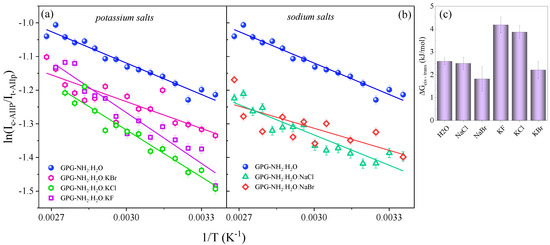 where and are the intensities of the cis and trans AIIp signals, and represent the AIIp Raman cross-sections of the cis and the trans conformers, R is the gas constant and T is the temperature. Figure 6a,b displays the plot of the log of the cis and trans AIIp intensity as a function of 1/T of GPG-NH2 hydrated in pure water and in water/salt mixtures. The linear fit of the data allowed us to estimate the free energy difference, , between the cis and trans conformers of GPG-NH2 in the different solvation environments (Figure 6c). Our results showed a 2.5 ± 0.3 kJ/mol free energy difference of GPG-NH2 in the water/NaCl solution, a value of 1.8 ± 0.5 kJ/mol in the water/NaBr solution, a value of 4.2 ± 0.3 kJ/mol in the water/KF solution, a value of 3.9 ± 0.3 kJ/mol in the water/KCl solution and a value of 2.2 ± 0.4 kJ/mol in the water/KBr solution.