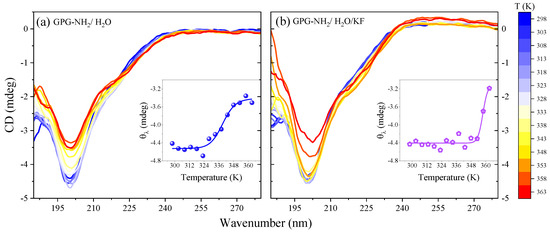 CD spectra as a function of temperature for GPG-NH2:H2O (a) and GPG-NH2:H2O:KF (b) solutions. Insets: temperature dependence of ellipticity θλ at 200 nm wavelength for the GPG-NH2:H2O and GPG-NH2:H2O:KF solutions.