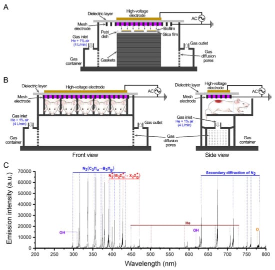 The LTGP device was similar to that used in previous studies [9,29]. As shown in Figure 1, the surface discharge structure of the LTGP consisted of a high-voltage plane electrode, a liquid-facing grounded mesh electrode with a hexagonal shape, and a dielectric layer (made of polytetrafluoroethylene) sandwiched between the two electrodes. The LTGP was generated when a sinusoidal high voltage was applied, and the discharge power density was 0.2 W/cm2 with good mesh-to-mesh homogeneity. The S. aureus biofilms in a petri dish (a diameter of 35 mm), which was smaller in size than the LTGP (40 mm × 40 mm), were placed under the LTGP, and the distance between the LTGP and the surface of biofilms was approximately 9 mm (Figure 1A). For the treatment of the wounds in a murine model, the posterior part of the mice was placed under the LTGP, and the distance between the LTGP and the wounds was between 8–12 mm (Figure 1B,C). The LTGP system was housed in a sealed organic glass box with a gas flow of helium and 1% artificial air (79% N2 + 21% O2) at a constant rate of 4 L/min. Artificial air was used as the source of ROS, while helium was used to enhance the production efficiency of those species as well as their flux on the treated samples via diffusion. The spectra emitted from the plasma were detected by an optical emission spectrometer (Andor, SR750) of which the head of optical fiber was located at 3 cm from the mesh electrode, and the detected spectral range was between 200 and 800 nm.