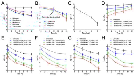 The S. aureus biofilms displayed strong tolerance to antibiotics. Treatment with antibiotics for 12 h decreased the number of living cells by less than two orders of magnitude (Figure 2A). Treatment with two antibiotics sequentially decreased the number of living cells by approximately 1–3 orders of magnitude (Figure 2B). LTGP treatment for 6 min decreased the number of living cells by approximately two orders of magnitude and treatment for 8 min decreased the number of living cells by approximately four and a half orders of magnitude, but the cell numbers of the biofilms recovered after 12 h of culture without antibiotics (Figure 2C,D). The treatment of the biofilms using the working gas without applying a voltage exhibited little effect (Supplementary Figure S1). In the experiments of the combination of LTGP and antibiotics, the short-term treatment of LTGP for 2, 4, and 6 min and 1250 μg/mL ciprofloxacin, norfloxacin, or vancomycin, or 625 μg/mL rifampicin, were employed. The combination of LTGP treatment for 6 min and ciprofloxacin, norfloxacin, and rifampicin reduced the living cells in the biofilms close to the detection limit, while the combination of LTGP treatment for 6 min and vancomycin reduced more than five orders of magnitude living cells in the biofilms (Figure 2E–H). Therefore, the combination of LTGP treatment and antibiotics can effectively reduce the living cells in biofilms in vitro.