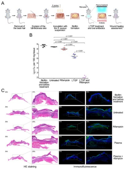 The infected groups were treated individually with LTGP, rifampicin, or a combination of LTGP and rifampicin for 3 days. Photographs of the wounds were taken on days 3, 6, 8, 10, 12, 14, and 16. The wound dimensions were blotted on transparent paper and measured using graph paper. For the treatment of LTGP on the wounds in murine models, the wounds were treated with LTGP for 6 min once every day for 3 days. For the rifampicin treatment groups, rifampicin (30 mg/kg) was given by intragastric administration every 12 h for 3 days. The untreated and treated mice were sacrificed 24 h after treatment. A cardiac blood sample was taken immediately following euthanization and was divided into two tubes: one tube for 0.2 mL was stored in anticoagulant tubes for the hematological test, and another tube was stored at 4 °C overnight, and then the serum was separated by centrifugation for the serum biochemical examination. After the collection of blood, the wound tissue samples were also fixed in 4% (v/v) paraformaldehyde for more than 24 h. Then, the fixed tissues were cleared in xylene and embedded in paraffin. To determine the center of the wound and adequately monitor the healing process, the whole sample was serially cross-sectioned (4 µm) with a microtome and mounted on a glass slide. The sections were stained with hematoxylin and eosin. All images were observed under a light microscope and captured at 20× magnification. Anti-S. aureus antibody (ab37644, Abcam) was used as the primary antibody in the immunofluorescence analysis and was scanned using a Pannoramic 250 Flash III.