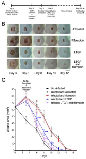 Analysis of wounds in mice. (A) A time diagram of wound treatment. (B) Wounds of Balb/c mice (n = 5 per group) infected with S. aureus and then treated with LTGP, rifampicin, or a combination of these two treatments, at day 3, 6, 8, 10, and 12. The bar represents 1 cm. (C) Wound sizes of the Balb/c mice skin lesions. Wounds were non-infected, infected and untreated, or infected and treated with LTGP, rifampicin, or a combination of these two treatments. Error bars represent the standard deviation (SD). The results shown are representative of an individual experiment. The blue star represented the p-value of the untreated group and the group treated with LTGP, the purple star represented the p-value of the untreated group and the group treated with the combination, and the gray star represented the p-value of the group treated with LTGP and the group treated with the combination *, p < 0.05; **, p < 0.01; ***, p < 0.001.