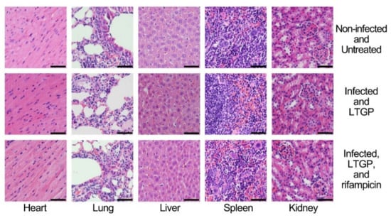 Histopathological analysis of the hearts, lungs, livers, spleens, and kidneys from the infected mice treated with LTGP or the combined treatment of LTGP and rifampicin, and the non-infected and untreated mice. The bars represented 50 μm.