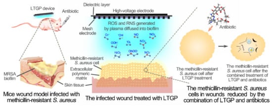 Based on these results, a model of LTGP treatment combined with antibiotics for the reduction of biofilm was proposed (Figure 6). Reactive oxygen species generated by LTGP, such as O2•−, diffused into biofilms, entered into S. aureus cells and caused damages, which synergize with antibiotics for the reduction of biofilms. The combined application of LTGP treatment and antibiotics could also efficiently reduce biofilms in the murine wound model. Therefore, LTGP treatment combined with antibiotics can effectively reduce biofilms formed by antibiotic-resistant bacteria. Low-temperature gas plasma combined with antibiotics could be developed into a potent therapeutic strategy for wound infections.