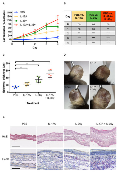 Psoriasis is a chronic skin disease caused by the excessive secretion of inflammatory cytokines affecting 2–3% of the global population [1]. Psoriatic skin lesions are associated with increased infiltration of immune cells, which includes different subpopulations of T cells and neutrophils. These cells affect the cytokine milieu and thus the behavior of keratinocytes, including their altered differentiation. It was reported that type 1 helper T (TH1) cells, whose development is stimulated by IL-12, are increased in psoriatic lesions, and associated proinflammatory cytokines, including tumor necrosis factor (TNF) α and interferon (IFN) γ, are elevated [2,3,4]. In addition, T helper 17 (TH17) cells are critical for the psoriatic phenotype [5,6]. This is also undermined by the strong psoriasis-like skin phenotype upon transgenic expression of IL-17A, a key cytokine produced by TH1 cells, under the control of the keratin-14 promoter in mice [7]. In addition to IL-17, IL-23 is also involved in psoriasis. IL-23 is produced mainly by dendritic cells and macrophages and activates TH17 cells, thereby promoting IL-17 production. It has been suggested that the IL-23 effects are dependent on IL-17A [8,9,10], which is also consistent with the findings that neutralizing anti-IL-17 antibodies, including Secukinumab and Ixekizumab, are approved as first-line treatment of moderate-to-severe plaque psoriasis [11,12]. These drugs showed effectiveness in all the various subtypes of psoriasis and in various TH17-related conditions [13,14]. Blocking the p19 subunit of IL-23 with selective antibodies such as Guselkumab and Risankizumab inhibits the intracellular and downstream signaling of IL-23 and is highly effective in the treatment of psoriasis [15,16]. In addition to the IL-23–IL-17 axis [17], evidence is accumulating that IL-36 cytokines are essential in psoriasis [18,19]. The three members, IL-36α, β, and γ, encoded by IL36A, B and C in humans and Il1F6, 8 and 9 in mice, belong to the IL-1 cytokine family and possess multiple roles in host immunity and several inflammatory diseases [20,21]. Among the IL-36 members, IL-36γ plays a dominant role in the pathomechanism of psoriasis [18,19]. So far, using keratinocyte monolayers and an in vitro 3D psoriasis model, we observed that IL-17A induces IL-36 cytokines and that a feedback loop between IL-17 and IL-36 cytokines provokes and maintains psoriasis pathology [22]. The role of IL-36 was further demonstrated by using IL-36R antagonistic antibodies in a mouse model of psoriasis, which is induced by the TLR7 agonist imiquimod [23], and which ameliorates the phenotype [24]. It is highly expressed in psoriasis lesions, produced by epidermal keratinocytes, and to a lesser extent by dermal fibroblasts and endothelial cells. Blood serum levels of IL-36 are associated with disease activity [25]. It was reported that treatment with the anti-TNF-α drug etanercept decreases IL-36γ serum levels [25]. Additionally, topical treatment with calcipotriol suppresses IL-36γ expression in psoriasis plaques [26]. Furthermore, small molecules have been developed and tested in preclinical models of psoriasis that inhibit neutrophil proteases, which are responsible for the activation of IL-36 [27]. A phase 1 study with the IL-36 receptor inhibitor BI655130 showed beneficial effects in generalized pustular psoriasis after application of one intravenous dose [28]. Generalized pustular psoriasis is a potentially life-threatening distinct form of psoriasis. Importantly, it was noted that a homozygous mutation in the gene encoding the IL-36 receptor antagonist reduces its expression and function, promoting unregulated secretion of inflammatory cytokines associated with generalized pustular psoriasis [29]. Il-36 cytokines also play a role in palmoplantar pustulosis (PPP), which is much more common and difficult to treat. In psoriatic arthritis (PsA) high levels of IL-36 cytokines were found in synovium and appear to play a role in synovial inflammation [30]. To further evaluate the role of the IL-17A–IL-36γ cytokine axis for the pathomechanism of psoriasis, we established an ear injection model. We found that IL-17A and IL-36γ cooperate in promoting a psoriasis-like phenotype and infiltration of neutrophils. Moreover, a gene expression program is activated that is comparable to alterations seen in psoriasis.