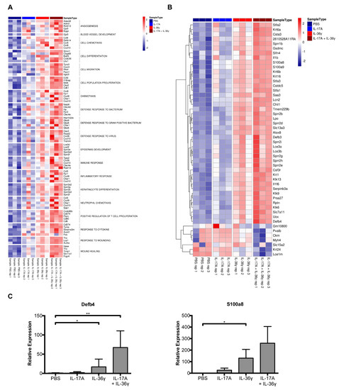 Identification of differentially expressed psoriasis-associated genes in mice treated with IL-17A and IL-36γ. (A) Heat map generated from RNAseq data reflecting gene expression values in four conditions (treatment with PBS, IL-17A, IL-36γ, or both cytokines). Nineteen gene sets relevant for psoriasis were selected. The top five significantly regulated genes (with a fold change greater or equal to two and a p-value less than 0.01) of every gene set are presented. The 12 columns of the heat map from left to right correspond to individual mice of the indicated treatment. (B) Heat map of the top 50 differentially expressed genes. The 12 columns of the heat map from left to right correspond, respectively to PBS, IL-17A, IL-36γ, IL-17A + IL-36γ. (C) The expression of the genes encoding S100a8 and Defb4 (ortholog of human hBD2) after treatment with IL-17A and IL-36γ as indicated was analyzed by RT-qPCR analyses. * p < 0.05, ** p < 0.01.