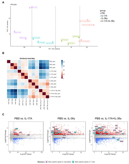 As mentioned before, neutrophils and T-cells play a crucial role in developing and maintaining psoriasis inflammation. We expected that in the RNA-seq dataset, obtained from biopsies of mouse ears that include infiltrating cells, signatures of both neutrophils and T cells should be detectable. Therefore, genes that are preferentially expressed either in neutrophils or in T cells were evaluated [39,40]. After injection of IL-17A, only Trbv2 (specific for T cells) showed a statistically significant increase as visualized in the volcano plot (Figure 3C). Four neutrophil-specific genes, including Cxcr2, were upregulated. Mice treated with IL-36γ revealed significantly more genes with expression relatively specific to T cells and neutrophils that were upregulated. In mice treated with both cytokines, the highest number of genes with expression relatively specific to neutrophils and T cells was identified when compared to mice treated with IL-36γ or IL-17A alone, confirming the stainings shown in Figure 1E.