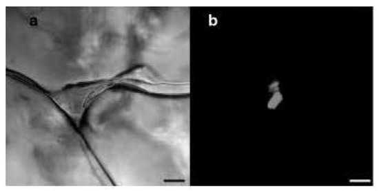 (a) Brine inclusions in sea ice containing two bacteria inside a triple junction between ice crystals. The scale bar at the bottom of the image is 10 μm long. (b) Epifluorescent image highlighting the presence of the two bacteria in the junction. After Junge et al., 2001 [9].