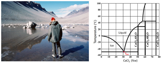 (Left) Don Juan Pond in Antarctica is a CaCl2-rich brine lake [46]. Credit: Ralph Lewis. (Right) Phase diagram indicating that the eutectic temperature of CaCl2 is −50 °C [47], Don Juan Pond’s typical winter temperature [46].