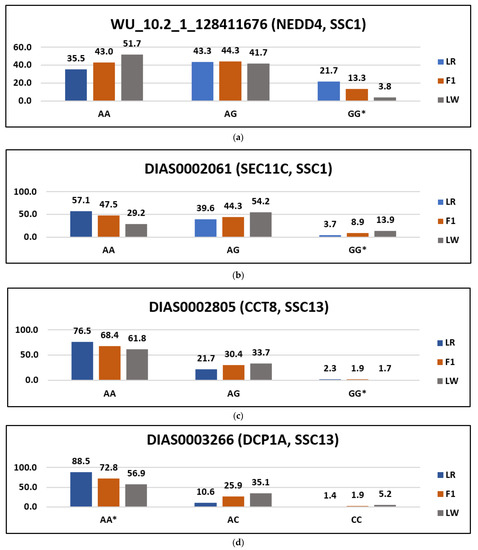 The role played by the variants of the genes NEDD4, SEC11C, DCP1A, CCT8, PKP4 and TENM3 in pig phenotypes has not been published in other studies to date. We can note that in our sample, a high frequency of potential deleterious variants was noted for LR on the DCP1A gene, and for LW on TENM3 and PKP4. In all cases, frequencies of genotypes at F1 occupied intermediate values between LR and LW, which indicates the possibility to consider the potential decrease in the negative influence of harmful variants concerning thoroughbred pigs.