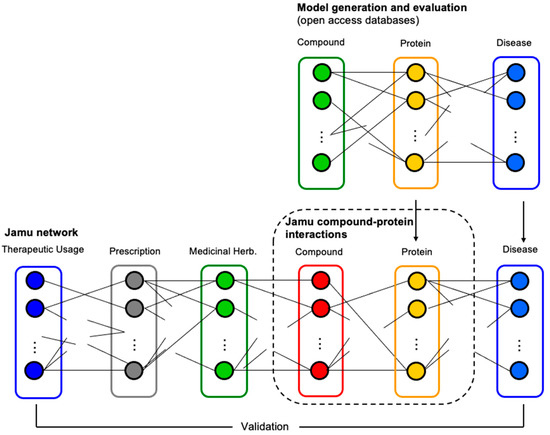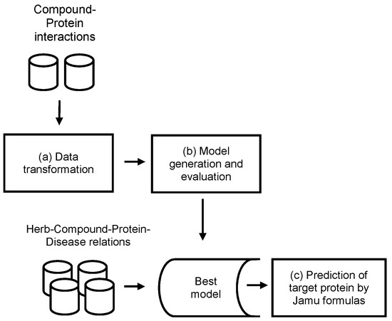 Jamu medicines consist of a combination of medicinal plants and are used to treat various diseases. In this work, we exploit information about compound and protein interactions from open access databases to predict compound–protein interactions in the context of Jamu formulas. The concept of the proposed method is depicted in Figure 1, which mainly consists of three processes: (a) data transformation, (b) model generation and evaluation, and (c) prediction of targeted proteins by Jamu formulas.