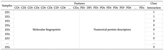 Data representation. Each data sample DTk is composed of molecular fingerprints (CD1, CD2, CD3, …, CDm) and numerical protein descriptors (PD1, PD2, PD3, …, PDn).