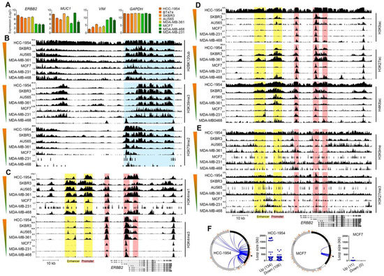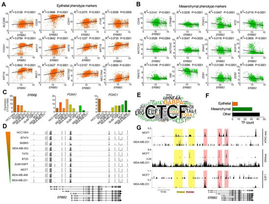 Since DNA-level epigenetic regulation (promoter CpG island methylation) has no role in the expression of ERBB2, we hypothesized that chromatin remodeling may control ERBB2 expression in the epithelial-like and mesenchymal-like breast cancer cells. To test this, we first studied enrichment of transcription factors at ERBB2 chromatin in the cells identified by ChIP-seq (indexed in ChIPbase v2.0 database). The results showed enrichment of 82 transcription factors within a region 10 kbp upstream and 10 kbp downstream of the ERBB2 gene motif Y in 3740 human biological samples. Of 82 transcription factors, eight (CDX2, FOXA1, FOXA2, KLF9, MBD3, MXI1, RUNX3, SP1) were regulators of epithelial maintenance, and 31 (ATF2, E2F1, E2F6, E2F7, EGR1, ELF2, ETS1, ETV1, FOS, FOXM1, FOXP1, FOXP2, GATA1, GATA2, GATA3, GATA6, HOXC9, JUNB, JUND, KDM5A, MAX, MAZ, MYC, MZF1, NANOG, RELA, SMAD4, STAT4, STAT5A, TEAD6, ZBTB7A) were master regulators of mesenchymal phenotype during EMT (Figure 1E,F).