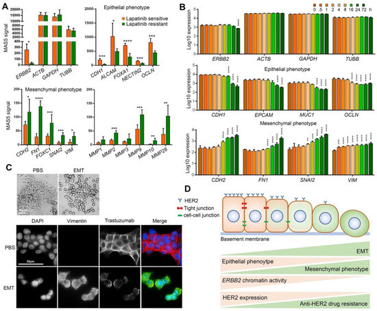 We next investigated the role of EMT in the development of anti-HER2 drug resistance in HER2-positive breast cancer cells. We studied the mRNA expression of ERBB2, epithelial phenotype markers CDH1, ALCAM, FOXA1, NECTIN2, and OCLN, mesenchymal phenotype markers CDH2, FN1, FOXC1, SNAI2, and VIM, as well as matrix metalloproteinase MMP1, MMP2, MMP3, MMP9, MMP10, and MMP28 in lapatinib-sensitive and acquired lapatinib-resistant BT474 cells. The array expression profiling data was obtained from the GEO database (Series GSE16179 [26]). Lapatinib-resistant cells showed lower expression levels of ERBB2 and epithelial marker genes, and higher expression levels of the mesenchymal marker genes and MMPs when compared with the lapatinib-sensitive cells (Figure 3A). These results indicate that lapatinib-sensitive cells are epithelial-like cells with higher HER2 expression, while lapatinib-resistance cells are mesenchymal-like cells with lower HER2 expression. These results suggest that EMT induces resistance to lapatinib via downregulating HER2 expression.