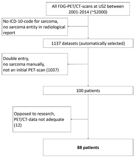 - Chen, L.; Wu, X.; Ma, X.; Guo, L.; Zhu, C.; Li, Q. Prognostic value of 18F-FDG PET-CT-based functional parameters in patients with soft tissue sarcoma: A meta-analysis. Medicine 2017, 96, e5913. [Google Scholar] [CrossRef] [PubMed]