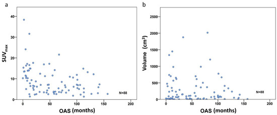 Correlation scatterplot for SUVmax (a) and volume (b) including all 88 patients. Only the SUVmax group shows significant correlation with OS (r = −0.414, p < 0.001), volume did not (r = −0.042, p = 0.699).