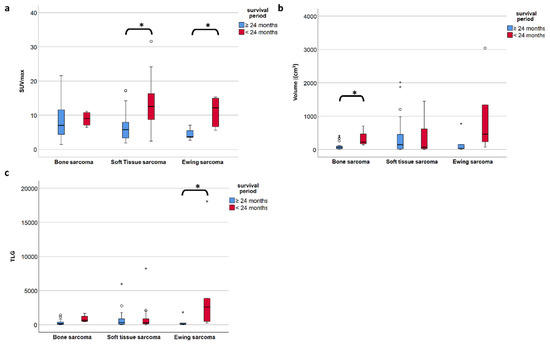 (a–c) The median SUVmax is significantly different in short- and long-term survival patients in soft tissue and Ewing sarcoma but not in bone sarcoma (a), whereas in bone sarcoma is the volume of the primary tumor is significantly different in short vs. long term survival (b). TLG only proves significant in ESFT but less so than SUVmax. (c). A p-value less than 0.05 is considered significant (*).